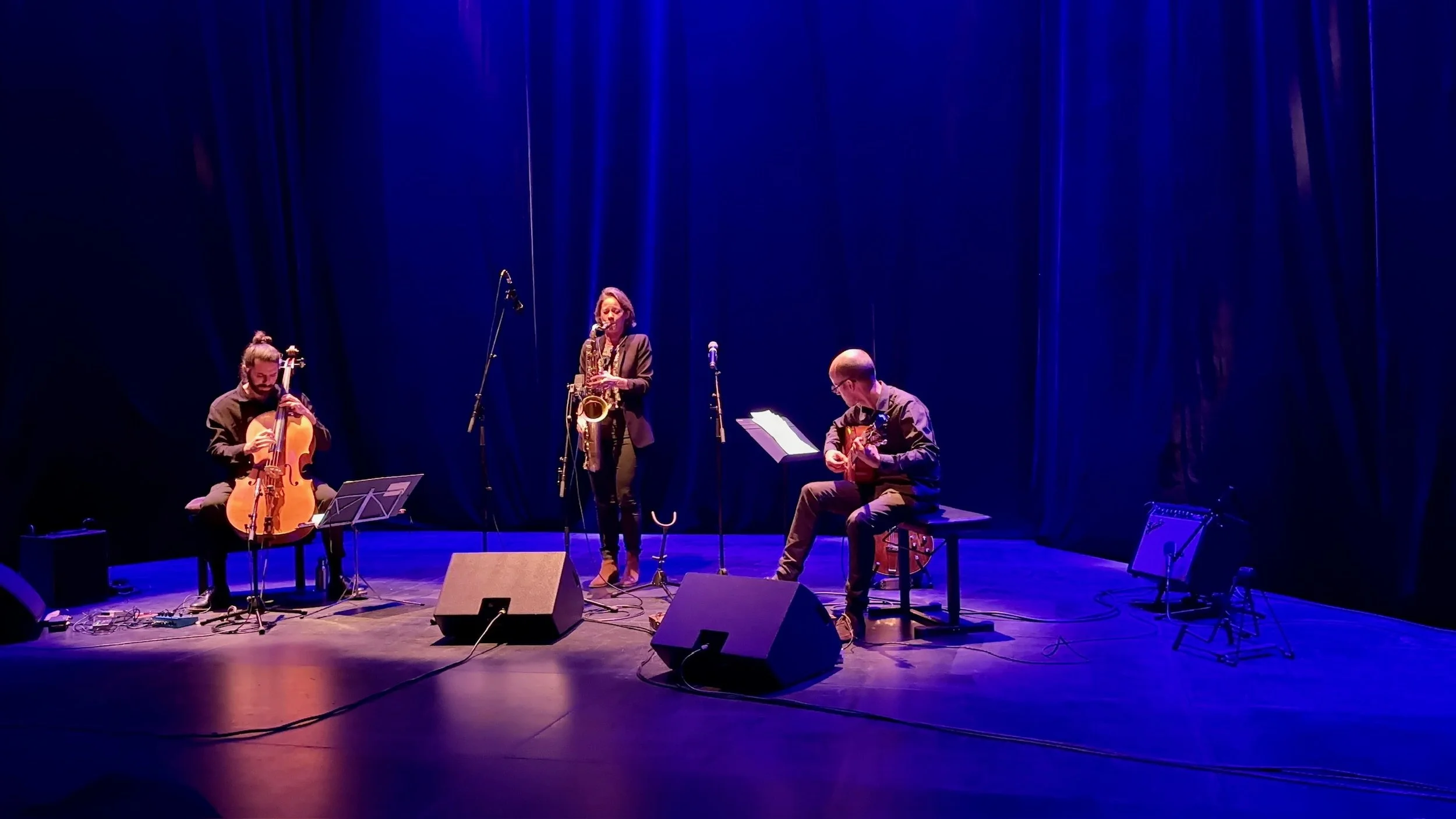En ouverture du festival, le vendredi soir : Sophie Alour Trio, formation composée de Paul Colomb au violoncelle, Pierre Perchaud à la guitare, et Sophie Alour au saxophone. On regrette que la salle ne soit pas pleine pour entendre un projet aussi ambitieux qu’original. En écoutant les morceaux issus de ses deux derniers enregistrements «Enjoy» et «Joy» (2021, 2020) et de son futur disque à venir en octobre «Le Temps Virtuose» (lequel verra s’ajouter au trio Anne Macéo à la batterie), on comprend pourquoi Sophie Alour a eu une Victoire du jazz en 2022 pour la catégorie «artiste instrumentale». Le jeu porté par le trio est ancré dans le sol, solide, d’une puissance solennelle, tout en exprimant des phrases aériennes, légères, qui raviront les oreilles averties et non averties, et feront naître une pléthore d’émotions. Les inspirations tantôt du côté de la musique irlandaise, tantôt du Moyen-Orient ou de l’Ukraine, proposent un voyage intéressant. Le travail du son, notamment avec l’ajout d’effets de delay, permet d’ajouter une vraie touche de modernité au jeu de guitare de Pierre Perchaud, qui dépoussière la représentation que l’on pourrait avoir du jazz.