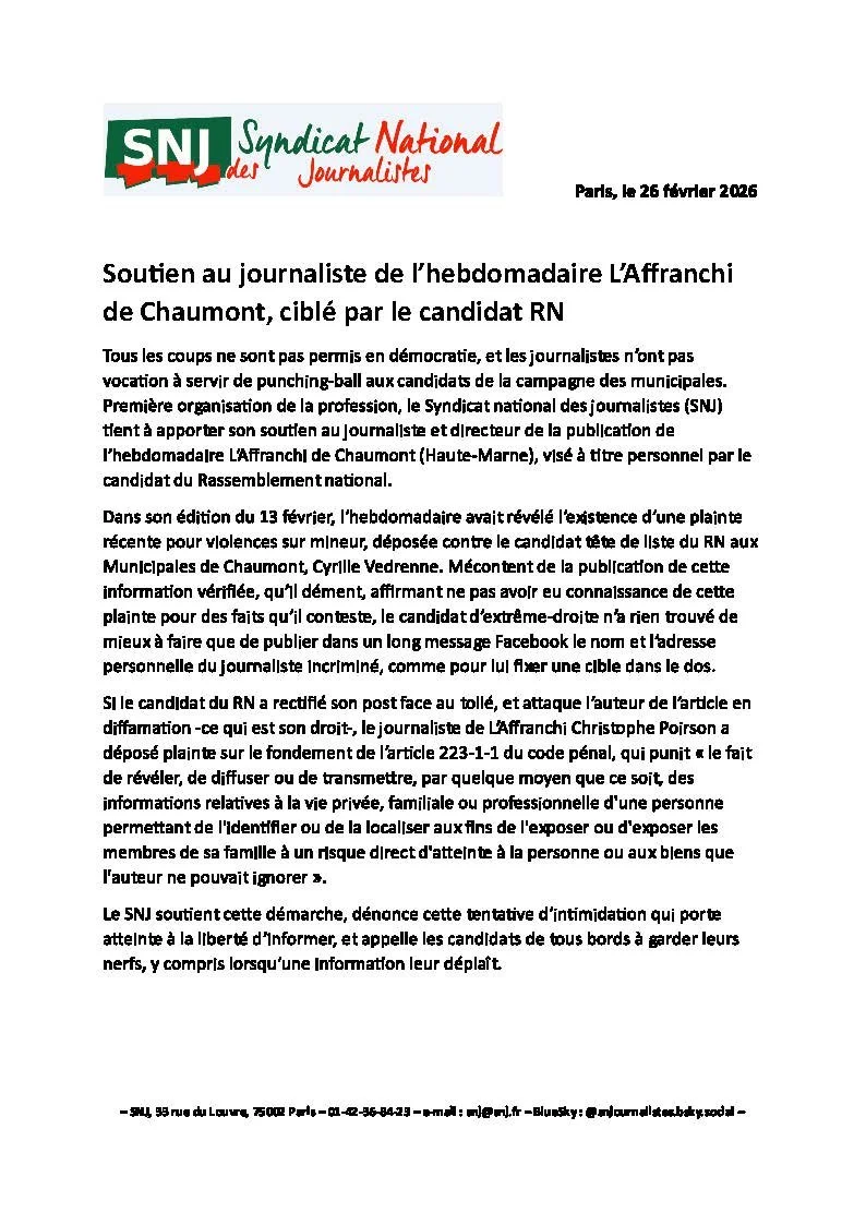 Communiqué de soutien du SNJ 27 févr. Écrit par Christophe POIRSON Merci au Syndicat National de Journalistes pour son soutien. Christophe POIRSON